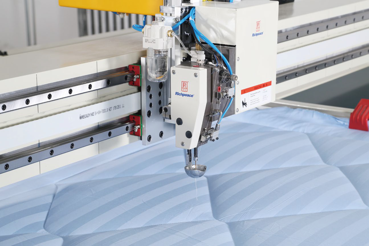 5、自動升降機頭,絎完一床物料后,機頭自動升起,方便更換新料框;專門定制的縫紉機頭,獨立壓腳驅動,適合各種薄厚不同材料的絎縫。