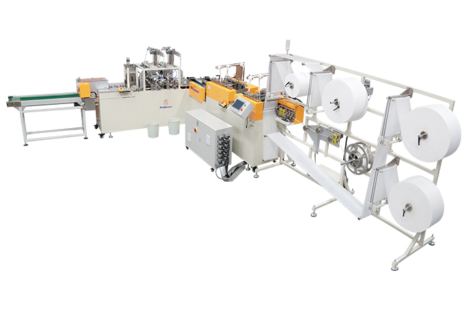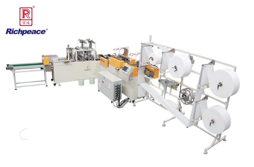 1.全自動四層面料柳葉型口罩成型加工。采取一出二結構,由柳葉型口罩打片機 1 臺,雙工位耳帶焊接機 1 臺,分流傳輸裝置一套,上料架一套,電控系統一套組成。結構精巧,操作簡單,性能穩定可靠。